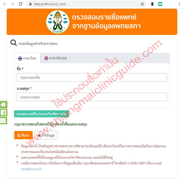 เว็บไซต์ : checkmd.tmc.or.th กรอกชื่อ (ไม่ต้องมีคำนำหน้า) และนามสกุลให้ถูกต้อง