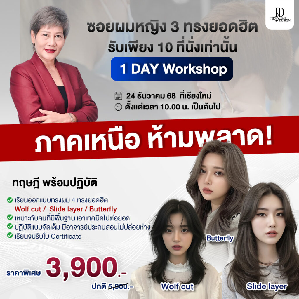 ชาวภาคเหนือห้ามพลาด!! เรียน 1 วัน ในวันที่ 24 นี้เท่านั้น กับคอร์ส ซอยผมหญิง 3 ทรงยอดฮิต สอนโดยอาจารย์ปู เจ้าแม่แห่งสถาบัน INDY มาคลาสนี้วันเดียว เปลี่ยนเป็นคุณได้ สอนแบบจับมือทำจริง อธิบายละเอียดทุกองศา ไม่ปล่อยให้นั่งงงคนเดียวแน่นอน