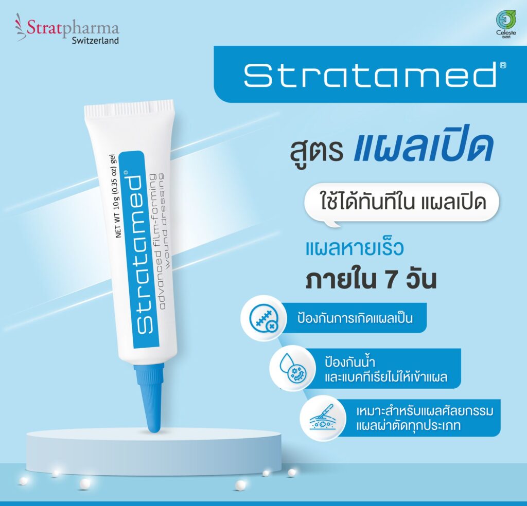 Stratamed คุณสมบัติสรรพคุณของสแตรทตาเมดเขาจะสร้างฟิล์มบางๆ เคลือบแผล ช่วยรักษาและป้องกันการเกิดแผลเป็นผิดปกติ แผลนูน (คีลอยด์) โดยเฉพาะแผลสดหลังผ่าตัด ศัลยกรรม ทำเลเซอร์ หรือกดสิว เร่งการสมานแผล ลดคัน ทำให้แผลเรียบเนียนขึ้น ทำความสะอาดและเช็ดแผลให้แห้งสนิท ทาเจลบางๆ ให้เคลือบเป็นฟิล์มบนแผล ใช้ทาวันละ 2 ครั้ง (เช้า-เย็น) อย่างน้อย 14 วัน หรือจนแผลปิดสนิท